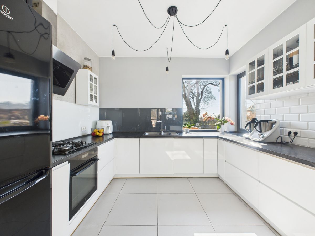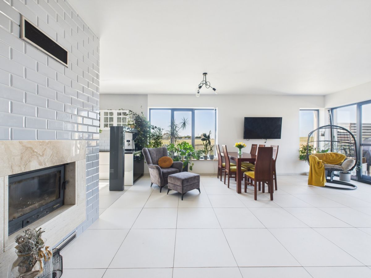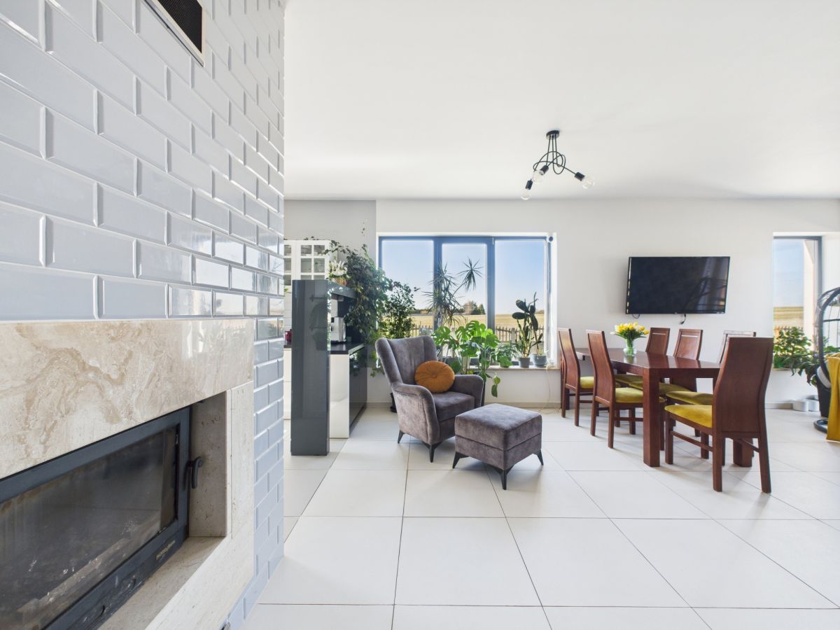 Sercem domu jest jasny salon z otwartą kuchnią i kominkiem - miejsce, gdzie domowe życie toczy się naturalnie. Duże okna wypełniają wnętrze światłem i otwierają widok na ogród, a kominek tworzy przytulną atmosferę podczas długich zimowych wieczorów.