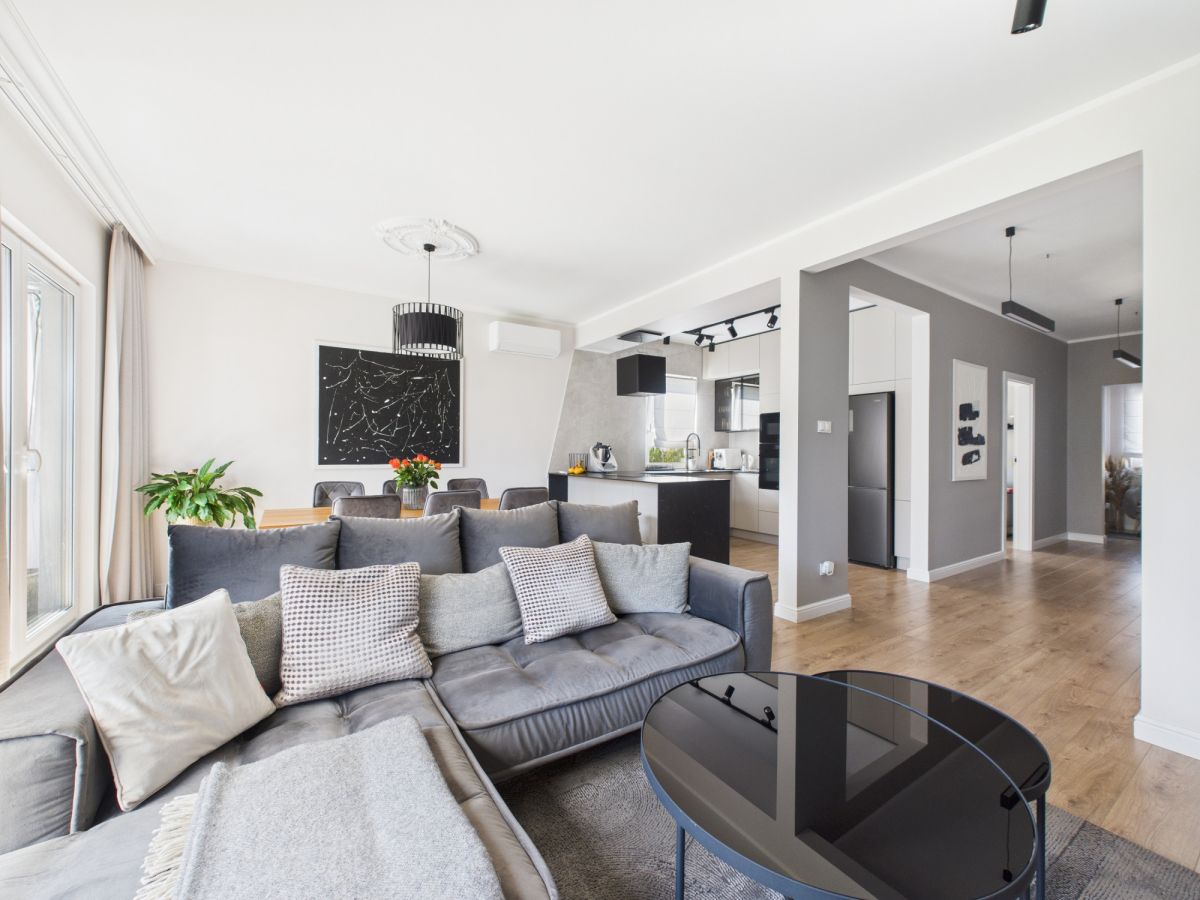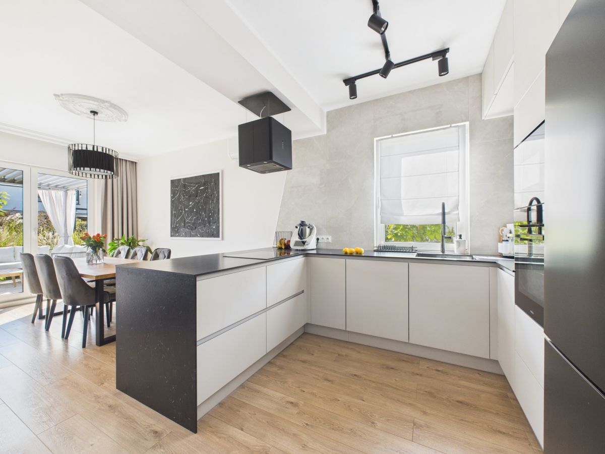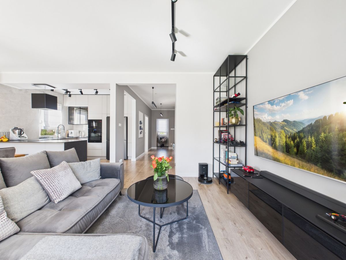 przestronny salon z aneksem kuchennym - serce domu z wyjściem na taras i ogród,